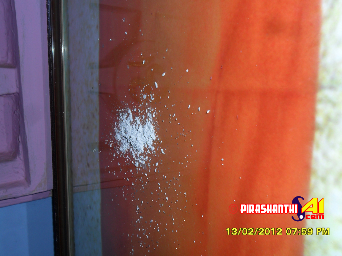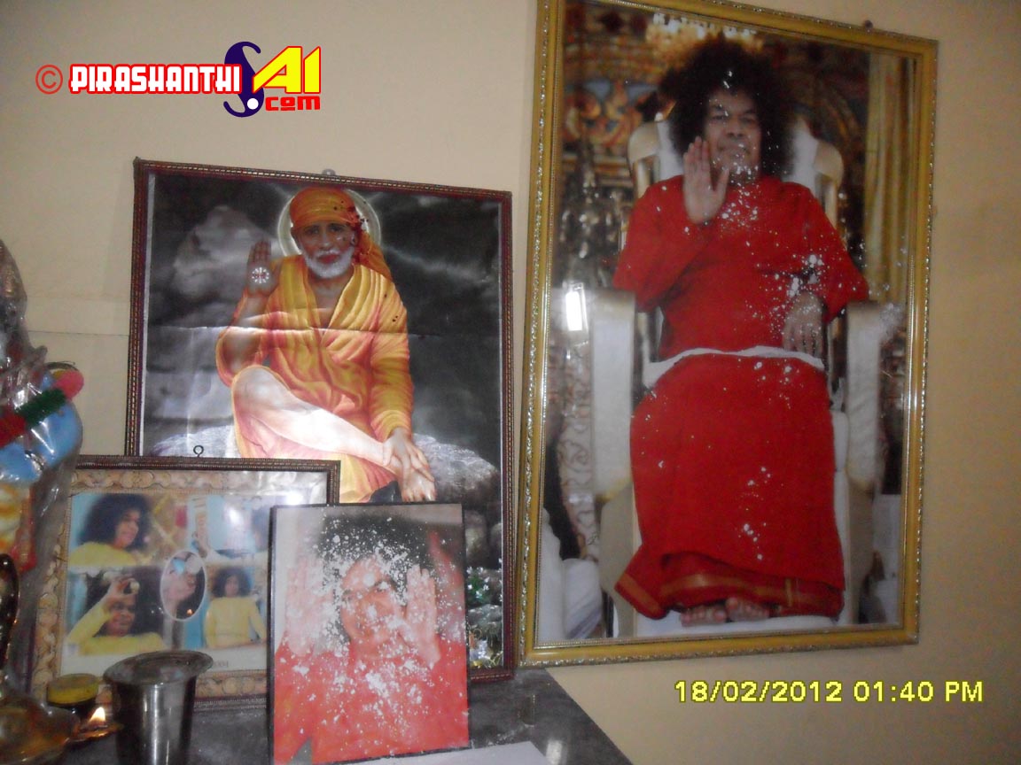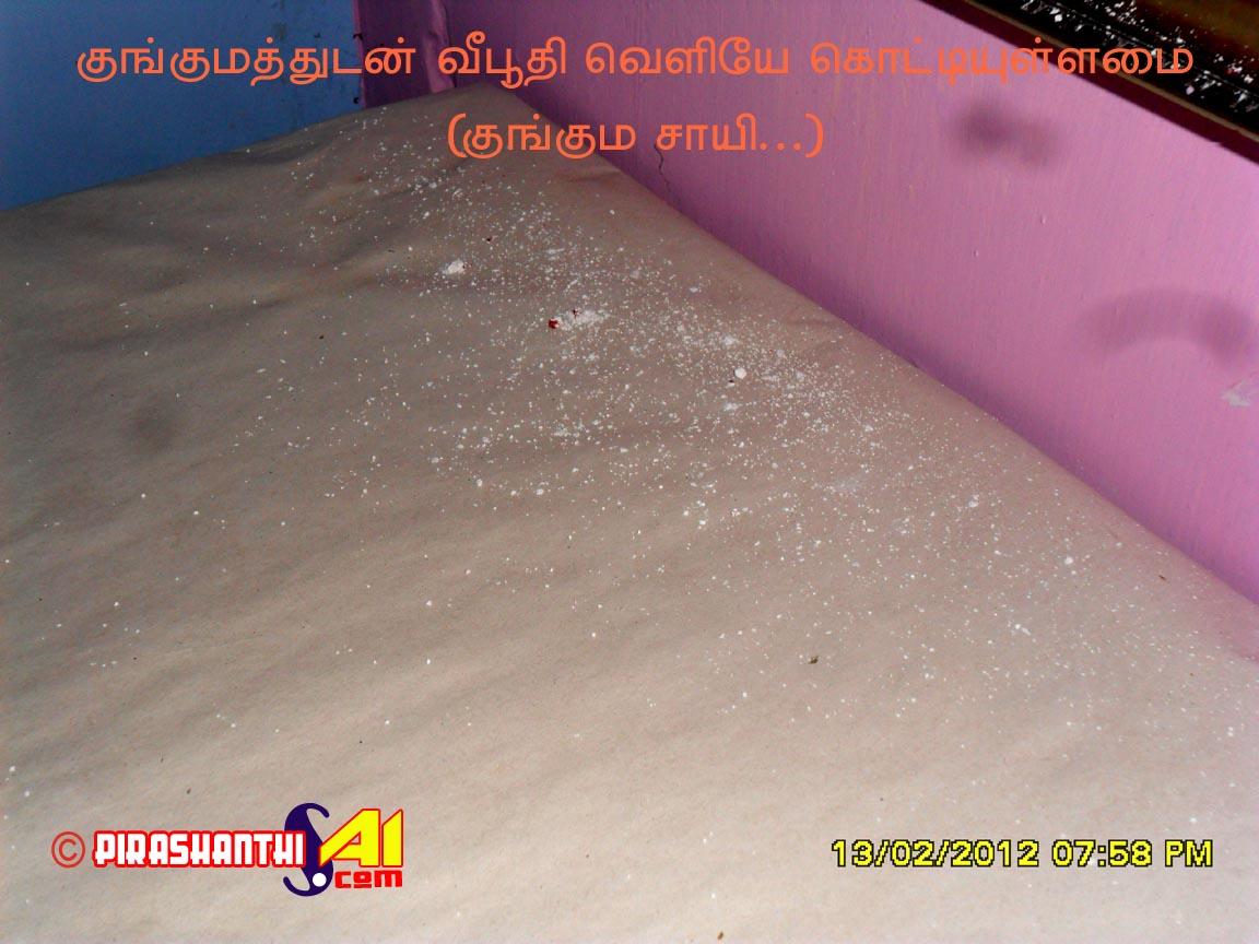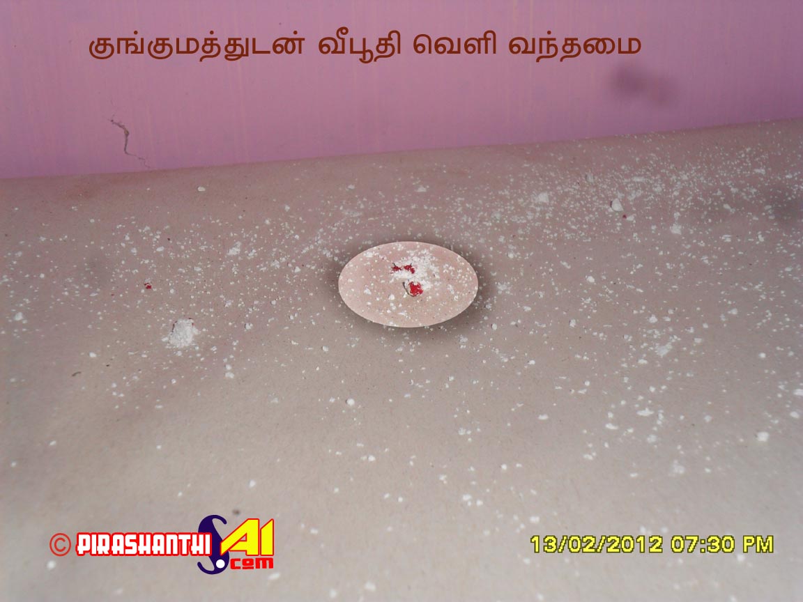 2012.02.05யாழ்ப்பாணம் சாயி நிலையத்தில் 5.2.2012 இல் வீபூதி வெளிவந்த படத்தில் இன்று மாலை (13.02.2012) வழமையான மாலை பஜனை முடிவடைந்த பின்னர் வீபூதி பெரியளவில் வெளிப்படத் தொடங்கியதுடன். அவ் வீபூதி குங்குமத்துடன் கூடியதாக வெளி வந்தமை அதிசயமாகவுள்ளது.